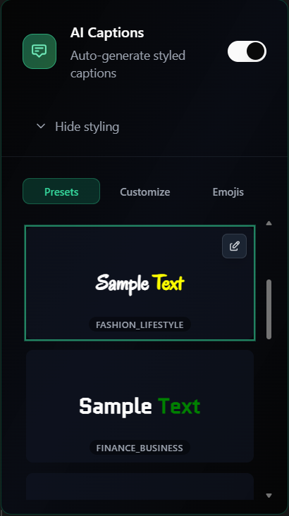 Curated Preset styles with caption customization and highight colors.